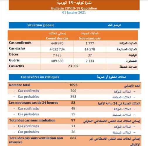 فيما عدد الوفيات بلغ، وفق آخر المعطيات الصادرة عن الوزارة، 37 حالة وفاة ليرتفع إلى 7425 حالة وفاة منذ تفشي الجائحة، وبلغ مجموع الحالات المستبعدة 4.032.735.