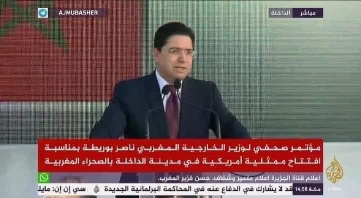 وكتبت القناة المذكورة، تعليقا على النقل الحي لفعاليات الإفتتاح الرسمي لقنصلية الولايات المتحدة الأمريكية بالداخلة، جاء فيه “مؤتمر صحفي لوزير الخارجية المغربي ناصر بوريطة بمناسبة افتتاح ممثاية أمريكية في مدينة الداخلة بالصحراء المغربية”.