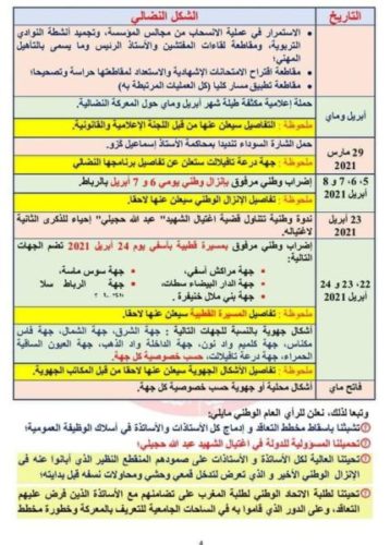 وأعلن الأساتذة أنهم سيخلدون فاتح ماي، كما سينسحبون من مجالس المؤسسات وتجميد أنشطة النوادي، ومقاطعة اقتراح الامتحانات الإشهادية، ومقاطعة حراستها وتصحيحها، ومقاطعة تطبيق مسار كليا وكل العمليات المرتبطة به.