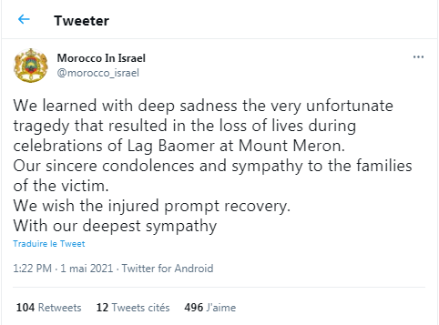 وأعرب المغرب عن حزنه للحادث، من خلال تغريدة لمكتب الاتصال المغربي في إسرائيل، نشرها على حسابه الرسمي، بالقول: “علمنا ببالغ الحزن المأساة المؤسفة للغاية التي أدت إلى خسائر في الأرواح خلال احتفالات بجبل ميرون”.