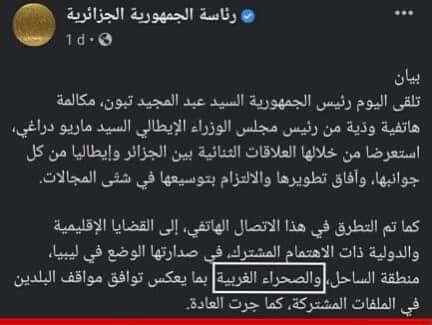 وبشكل مفضوح، أقحمت الرئاسة الجزائرية موضوع الصحراء المغربية في المكالمة التي جمعت تبون بنظيره الإيطالي، بالقول إنهما تطرقا خلال نفس المكالمة إلى “القضايا الإقليمية والدولية ذات الاهتمام المشترك، في صدارتها الوضع في ليبيا، منطقة الساحل، والصحراء، بما يعكس توافق مواقف البلدين في الملفات المشتركة، كما جرت العادة”.