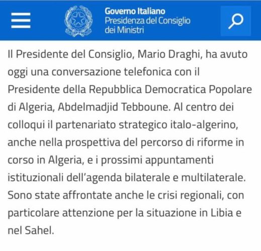 وفي سياق مماثل، قالت رئاسة الجمهورية الجزائرية إن عبد المجيد تبون “تلقى مكالمة هاتفية ودّية من رئيس مجلس الوزراء الإيطالي ماريو دراغي، استعرضا من خلالها العلاقات الثنائية بين الجزائر وإيطاليا من كل جوانبها، وآفاق تطويرها والالتزام بتوسيعها في شتّى المجالات”.