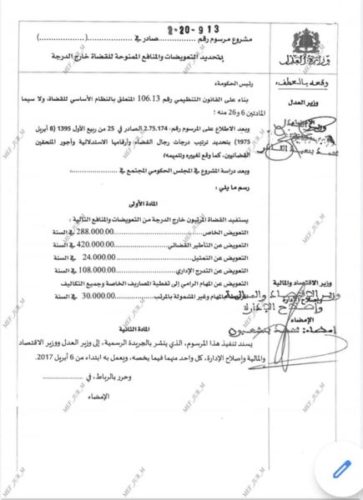 ويقترح مشروع المرسوم المتعلق بتحديد التعويضات والمنافع الممنوحة للقضاة خارج الدرجة. تخصيص 108 آلاف درهم في السنة كتعويض عن التدرج الإداري، و30 ألف درهم كتعويض عن المهام، بهدف تغطية المصاريف الخاصة وجميع التكاليف المرتبطة بالمهام وغير المشمولة بالمرتب.