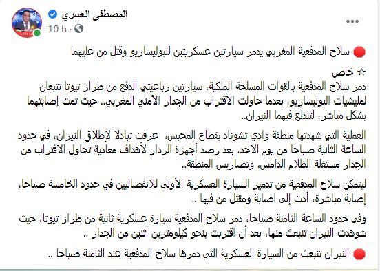 وأضاف العسري في تدوينة ذبجها على حسابه “ليتمكن سلاح المدفعية من تدمير السيارة العسكرية الأولى للانفصاليين في حدود الخامسة صباحا، إصابة مباشرة، أدت إلى إصابة ومقتل من فيها ..”