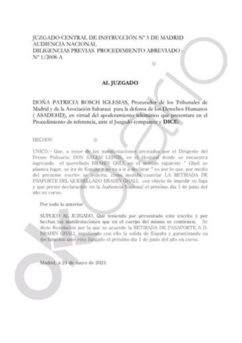 وحسب نفس الرسالة الموجهة إلى القضاء الإسباني، تطالب الهيأة الحقوقية نفسها بإصدار قرار يتم بموجبه الموافقة على سحب جواز سفر إبراهيم غالي، وبالتالي منعه من مغادرة إسبانيا وضمان إفادته أمام هذه المحكمة المركزية رقم 5، في الفاتح من يونيو المقبل “.