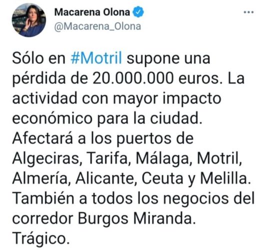 وأوردت البرلمانية والناطقة باسم مجموعة حزب فوكس بالبرلمان الإسباني، مكارينا أولونا، أن القرار المغربي سيخلف أضرارا جسيمة على الاقتصاد الإسباني، مبرزة أن ميناء “موتريل” لوحده سيفقد 20 مليون أورو.