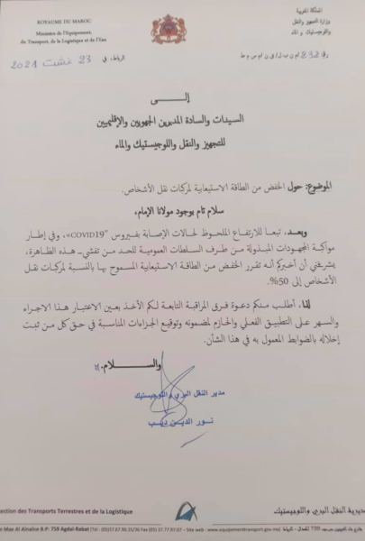 وجاء ذلك في دورية وقعها نور الدين ديب، مدير النقل البري بالوزارة المذكورة،وأوضحت الوزارة من خلال دورية موقعة من طرف نور الدين ديب، مدير النقل البري موجهة إلى المدراء الجهويين للوزارة الوصية أن هذا القرار يأتي في سياق الارتفاع الملحوظ لحالات الإصابة بكوفيد19 وفي إطار مواكبة المجهودات المبذوبة من طرف السلطات العمومية للحد من تفشي هذه الظاهرة.