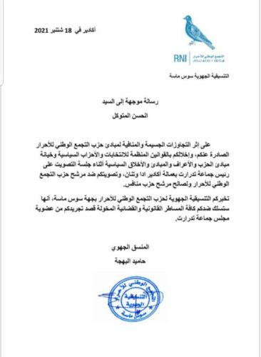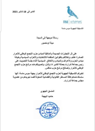 ووجهت المنسق الجهوي لـ”الأحرار” بسوس ماسة، حاميد البهجة، رسالة إلى كل من مينة أومنصور والحسن المتوكل، يبلغهما بقرار التنسيقية الجهوية سلوك كافة المساطر القانونية والقضائية المخولة قصد تجريدكم من عضوية مجلس جماعة تدرارت”.