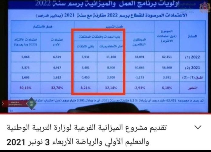 وجاء الكشف عن هذا الأمر خلال تقديم مشروع الميزانية الفرعية للوزارة المذكورة منتصف الأسبوع الجاري، حيت أظهرت وثيقة تم عرضها علال عرض مشروع المالية لوزارة التربية تبين الاعتمادات التي تم رصدها للقطاع برسم 2022 مقارنة مع 2021.