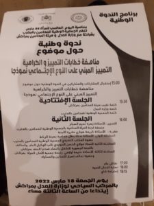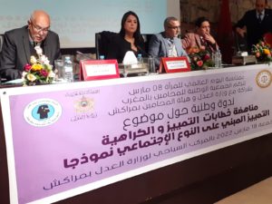 بمناسبة اليوم العالمي للمرأة 08 مارس اعلنت الجمعية الوطنية للمحامين بالمغرب بشراكة مع وزارة العدل وهيئة المحامين بمراكش عن إنطلاق اشغال ندوة وطنية حول موضوع ” مناهضة خطابات التميز والكراهية …التمييز المبني على النوع نموذجا”اليوم الجمعة 18 مارس 2022 بالمركب السياحي لوزارة العدل بمراكش.